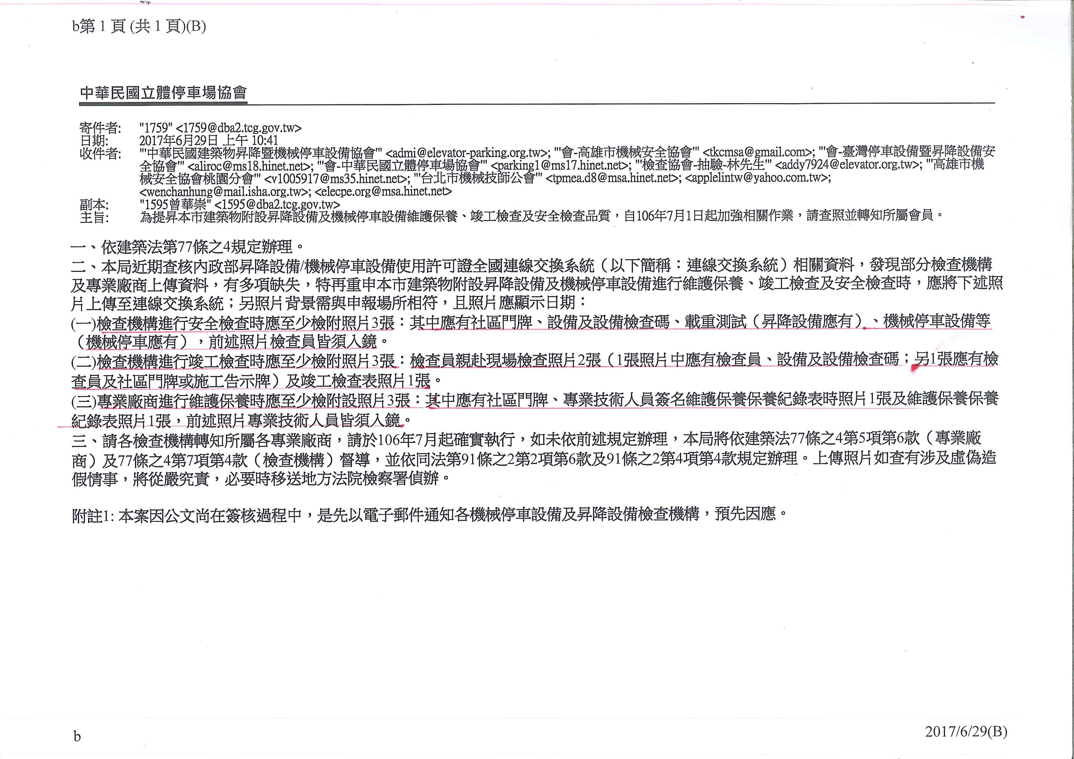附註1: 本案因公文尚在簽核過程中,是先以電子郵件通知各機械停車設備及昇降設備檢查機構,預先因應。